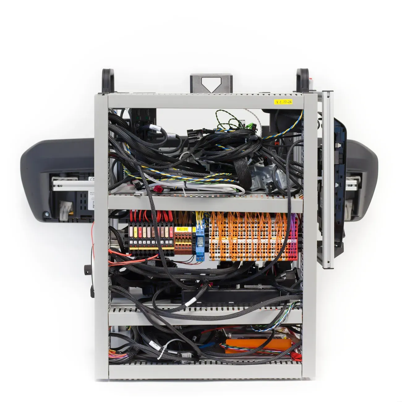 The advantage of this solution is that tests can be run without the need for an actual car. The MQB-EVO Test Bench is made of lightweight aluminum construction. The structure holds a wired harness fixed in a wire duct, which is intended for the connection of ECUs to evaluate technologies and accessories.